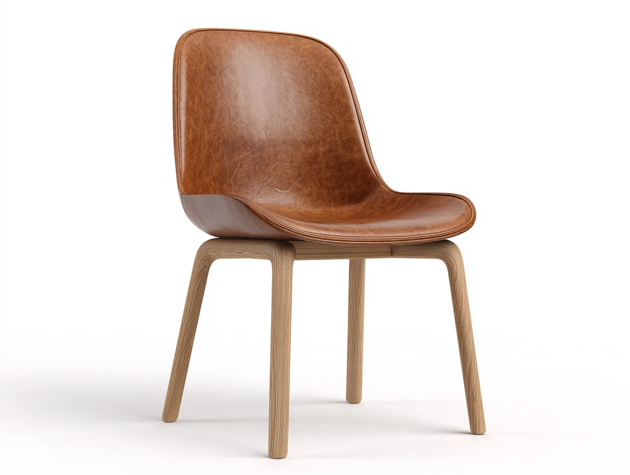 Die Sitzfläche und Rückenlehne sind mit Leder in Braun bezogen. Das Gestell besteht aus Holz und bietet eine stabile Konstruktion für den täglichen Gebrauch.