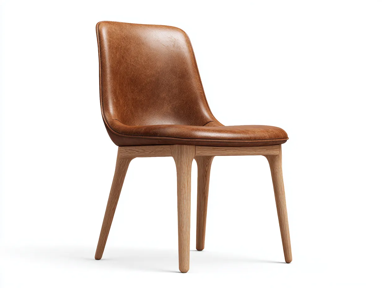 Die Sitzschale ist mit Leder in Braun bezogen. Das Gestell besteht aus Holz und sorgt für eine stabile Konstruktion sowie eine zuverlässige Nutzung im Essbereich.
