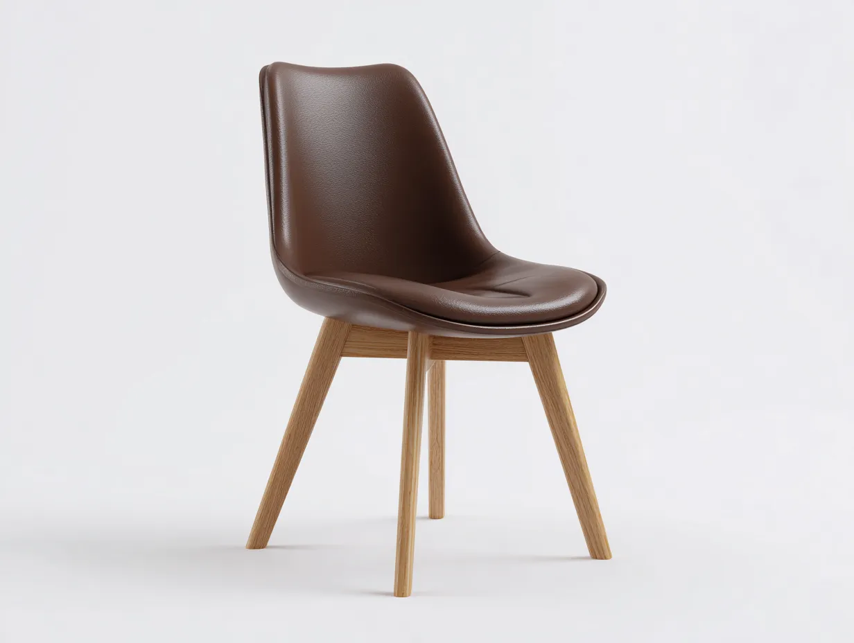 Die Sitzschale ist mit braunem Leder bezogen und weist eine gleichmäßige Oberflächenstruktur auf. Das Gestell besteht aus Holz in Naturfarbe und sorgt für Stabilität sowie einen sicheren Stand. Alle Übergänge sind sauber verarbeitet.